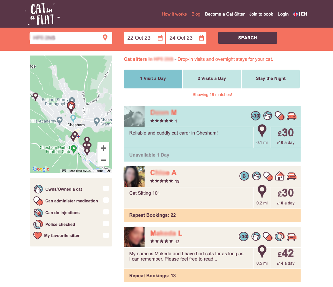 A list of available cat sitters near you on CAT IN A FLAT serach